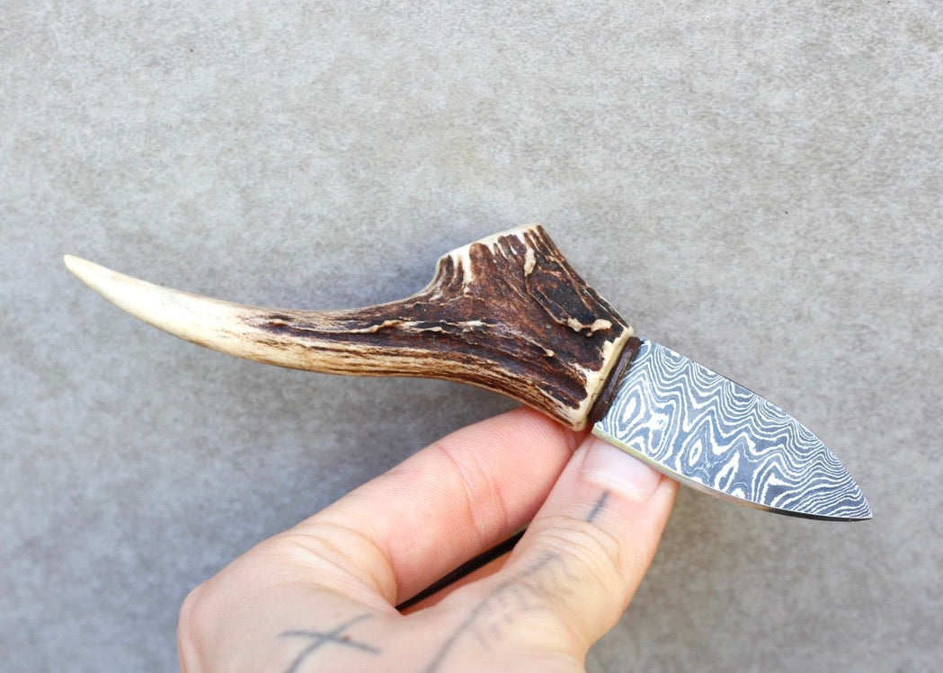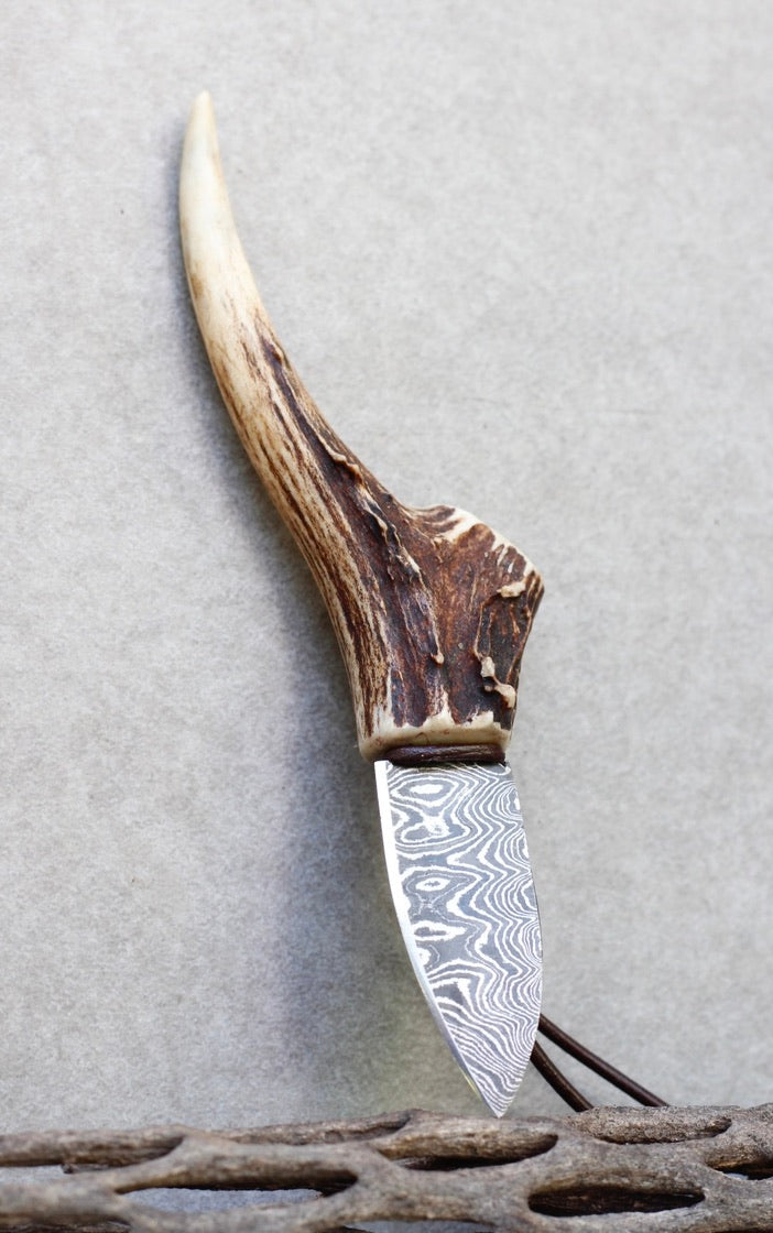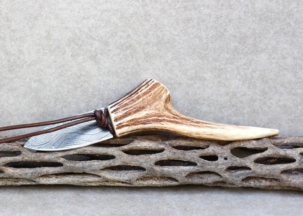 This is a handmade one of a kind piece made from : Naturally shed deer antler, Damascus steel, leather cord, and vegetable tanned leather sheath.
