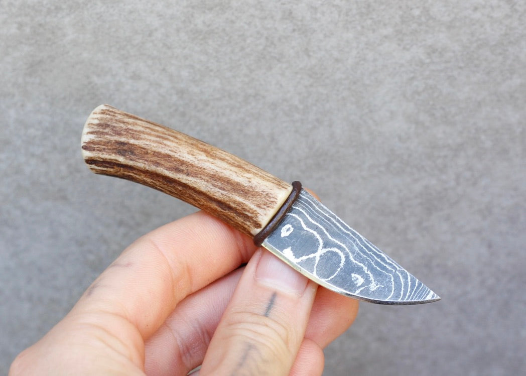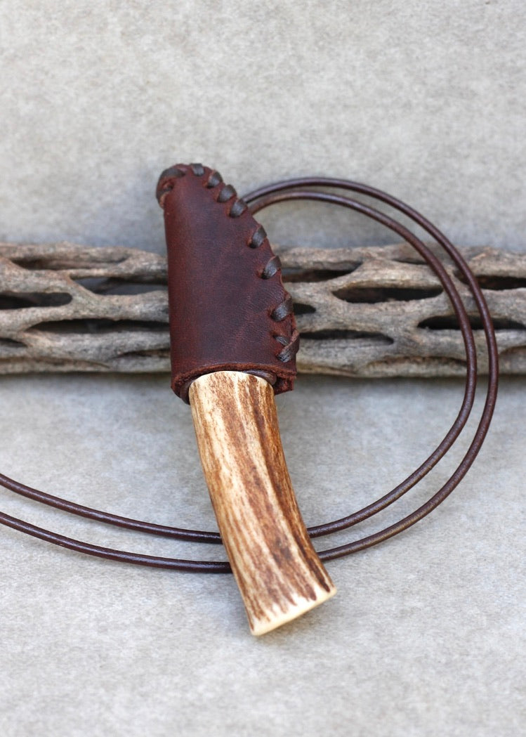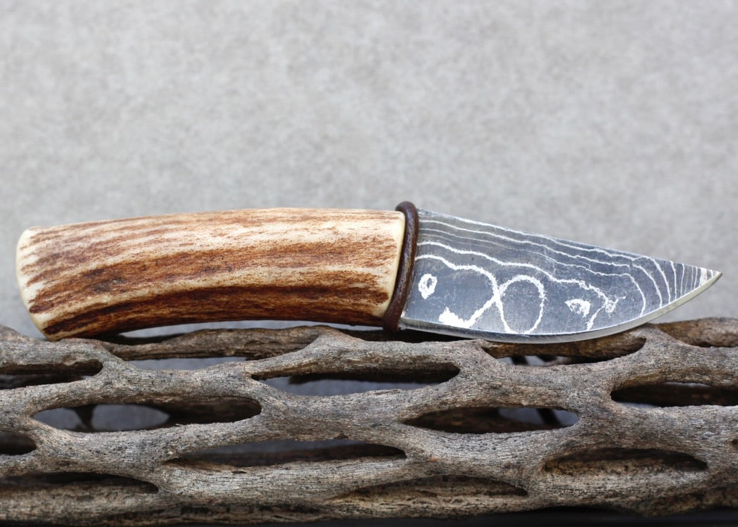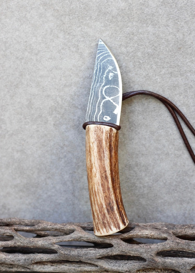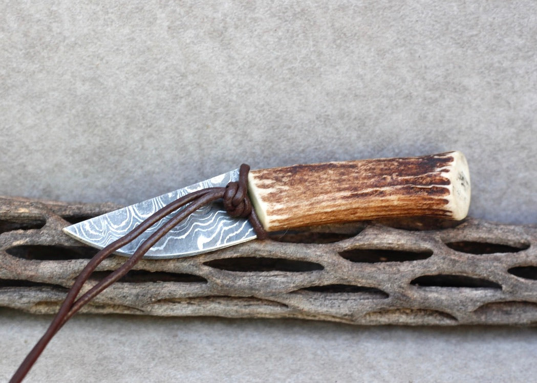 This is a handmade one of a kind piece made from : Naturally shed deer antler, Damascus steel, leather cord, and vegetable tanned leather for the sheath.